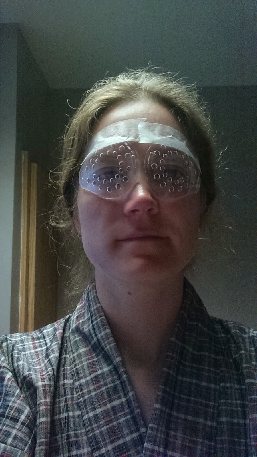 Until I'm back to normal, though, I get to sport these fancy taped-on eye protectors whenever I sleep, and sunglasses when I'm awake. I'm going to have a stylish weekend.